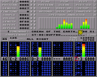 Trackers use a very peculiar speed system that is based on ‘ticks’ rather than BPM. The ‘tick’ is a subdivision of pattern row. The 6 speed would make each row last for 6 ticks’ worth of time, while 7 would be slower, with each row lasting 7 ticks. To make things even more messy – there are also a BPM-based settings in trackers, but let’s ignore it for now and focus only on speed here. The “F” command alters the speed of the song. By quickly doing it one will get some kind of “swing” feel. Try dry ratios as 8 and 4 or 3 and 5 for more pronounced swing.