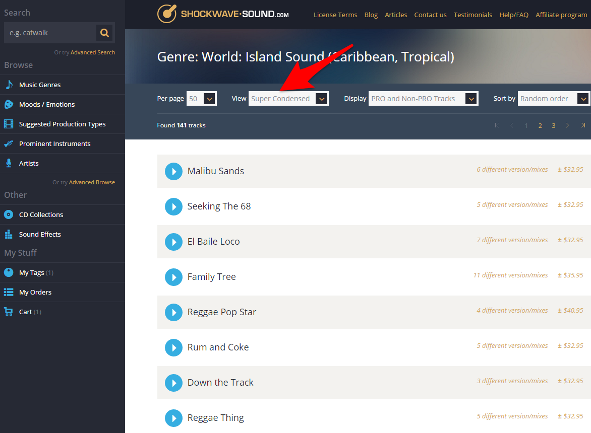 On any track listing (search result, genre browse, mood browse, etc.) you can now choose between the: